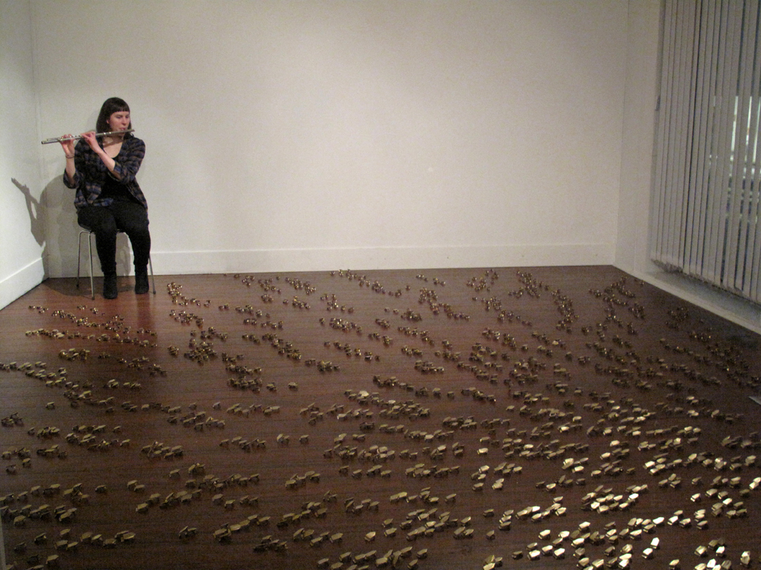 Gull-lakkerte origamifrosker. Space 4235 i Tromsø, februar 2011. Maija Liisa Ingebrigtsen spiller fløyte.